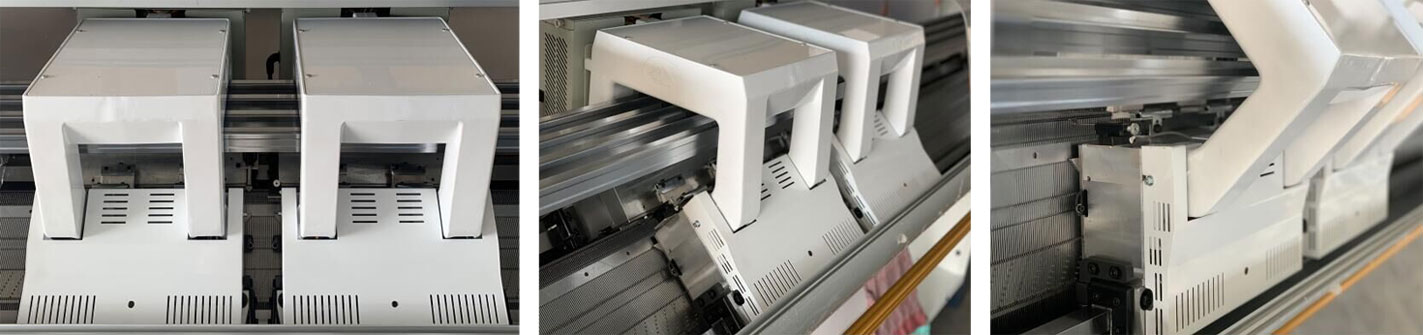 Feidhm cniotála: Tá feidhmeanna éagsúla cniotála aige, mar shampla corna snáthaid aistrithe cniotála, tuck, corna snáthaide glactha, poill phiocadh, corna snáthaidí ar leithligh, jacquard intarsia, agus mar sin de, is féidir a chinntiú go n-oireann an meaisín do gach cineál patrúin.